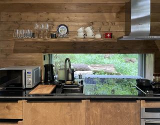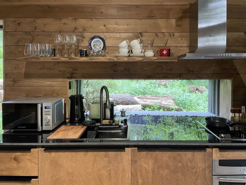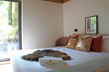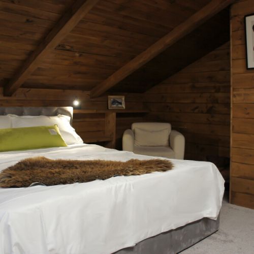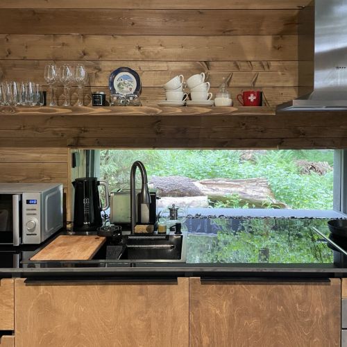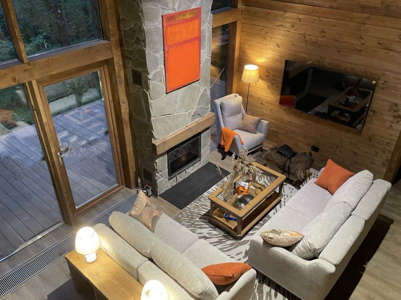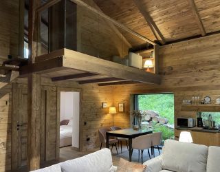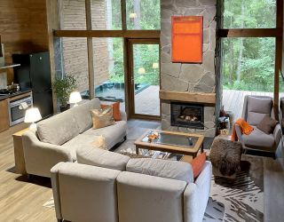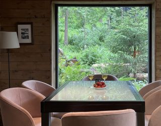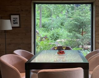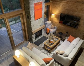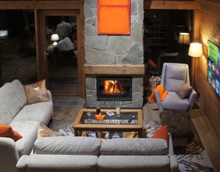 Архитектура и дизайн шале вдохновлены швейцарскими курортами, создавая ощущение горного отдыха. Фасад выполнен из натурального камня и дерева, а панорамные окна наполняют интерьер светом и связывают его с окружающей природой. Внутри гармонично сочетаются современный минимализм и альпийский уют: деревянные потолки, каменные элементы, стильная мебель и продуманная детализация.